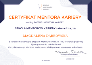 Nazywam się Magda Dąbrowska i jestem certyfikowanym mentorem kariery, certyfikowanym trenerem Radykalnego Wybaczania oraz coachem kognitywnym. Moją misją jest pomaganie kobietom w zmianie zarówno w życiu zawodowym, jak i osobistym.