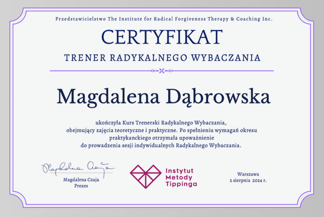 Magda stworzyła bezpieczną przestrzeń, w której mogłam otworzyć się i wyrazić swoje najgłębsze uczucia. Byłam zdziwiona, jak wiele łez wypłynęło podczas naszych sesji – łez, które były nie tylko wyrazem bólu, ale także ulgi i oczyszczenia. Magda nauczyła mnie, że twardość nie polega na tłumieniu emocji, ale na odwadze, by je przeżywać i zrozumieć.Terapia radykalnego wybaczania z Magdą była dla mnie podróżą w głąb siebie, która pozwoliła mi na nowo odkryć własną siłę i zdolność do przebaczenia, zarówno sobie, jak i innym. Dzięki jej wsparciu, zyskałam narzędzia, które pomogą mi w relacji z bliską sobą, ale również w wielu innych aspektach życia.